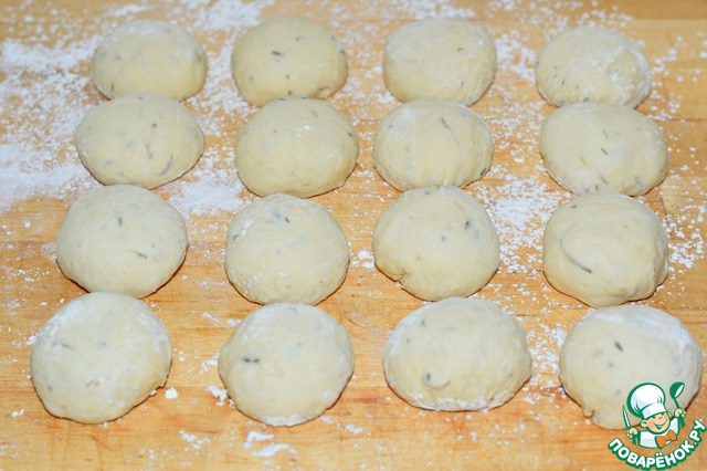 Выложить его на рабочую поверхность, присыпанную мукой, обмять. Разделить на равные части (примерно по 40 г каждая)