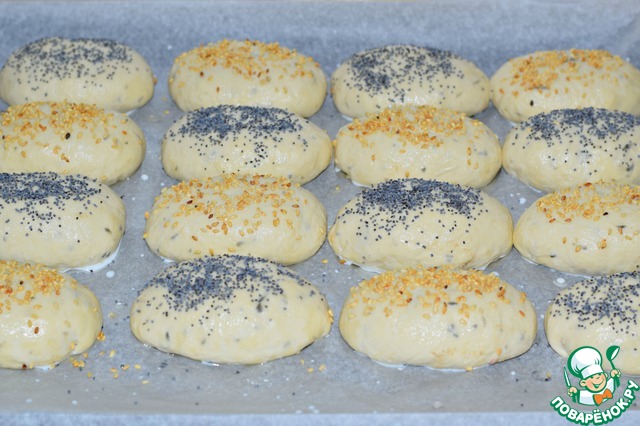 Каждый пирожок смазать молоком, посыпать маком или кунжутом (по вашему желанию).