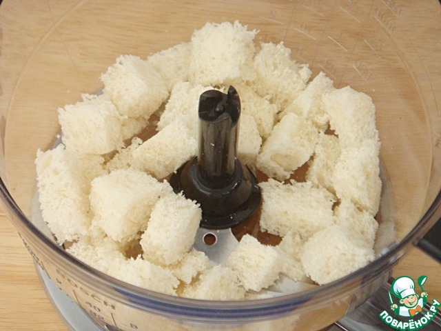 Измельчить кубики хлеба в кухонном комбайне. Перемалывать их необходимо небольшими порциями на высокой скорости. Лучше использовать функцию пульсации. Если ее нет, буквально на секунду нажать кнопку. Отпустить её, встряхнуть чашу, чтобы хлеб равномерно распределился. Потом снова нажать, отпустить кнопку, встряхнуть чашу и т. д.
