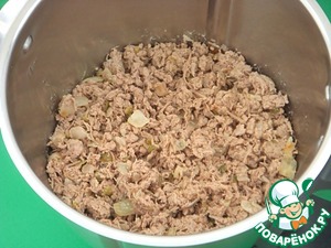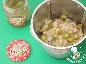 Крупно нарезанное вареное мясо, обжаренный лук и нарезанные ломтиками маринованные огурцы пропустить через мясорубку или сложить в измельчитель или в кухонный комбайн.