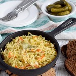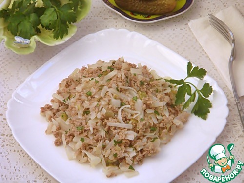 Все мы привыкли к популярному блюду "Макароны по-флотски". Предлагаю вам приготовить его с капустой. Получается сытное, сочное блюдо, пикантность которому добавят маринованные огурцы.