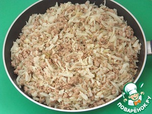 Добавить тушеную капусту, предварительно откинутую на дуршлаг. Добавить 200 мл бульона. Довести до кипения.
