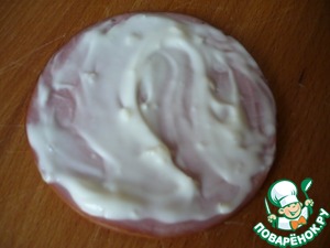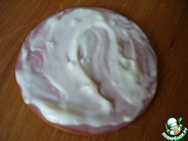 Берем кружочек говядины и намазываем его чесночным майонезом. Много не нужно.