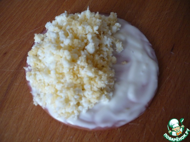 На один край кладем смесь сыра и яичных белков. (Конечно, можно сразу перемешать начинку и чесночный майонез, но их добавление по отдельности сделает готовые рулетики гораздо нежнее и более воздушными).