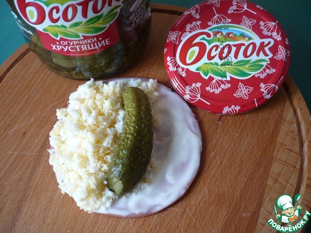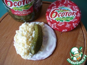 Сверху на смесь сыра и яичных белков положите хрустящий маринованный огурчик ТМ "6 соток".