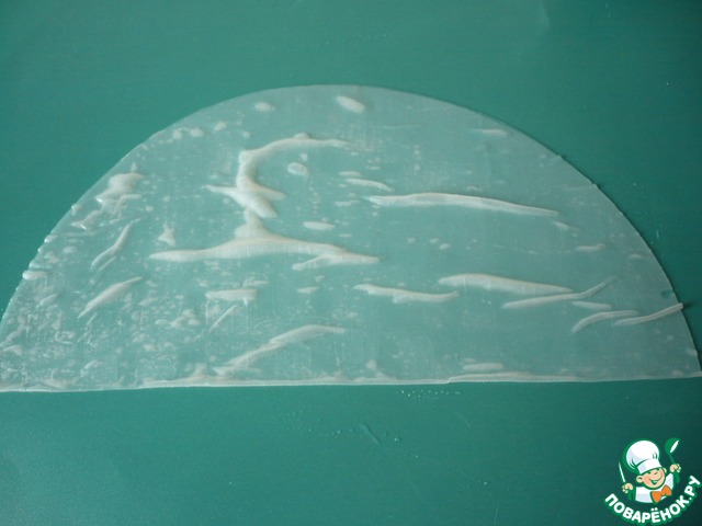 Теперь, чтобы хорошо свернуть рулетик я воспользовалась рисовой бумагой. (Согласно инструкции на упаковке намочите рисовую бумагу), а затем сверните лист пополам.