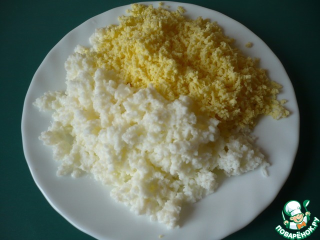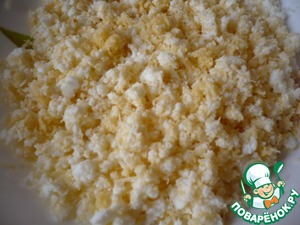 Добавляем к сыру измельченные яичные белки и все перемешиваем.