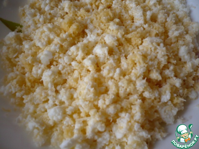 Поставим вариться куриные яйца. Когда яйца сварятся, очищаем их и отделяем белки от желтков. Измельчаем по-отдельности на самой мелкой терке.