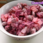 Свеклу отварить, очистить и нарезать маленькими кубиками.