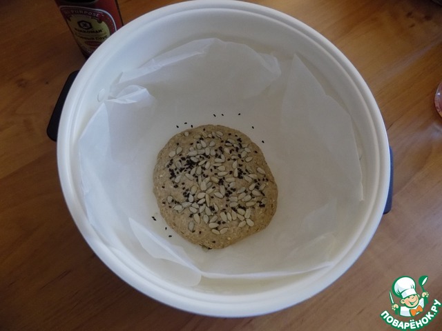 Чашу мультиварки обложила бумагой для выпечки. Верх булки посыпала семечками и чёрным кунжутом. Выложила тесто и поставила чашу в мультиварку. Включила режим "Хлеб". Он у меня 3 часа. Я делала маленькую булку и ингредиенты все убавила вдвое и соответственно режим выпечки хлеба убавила на час.