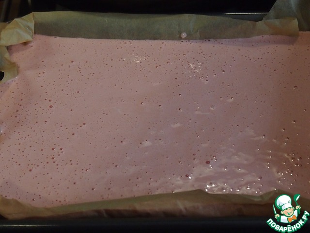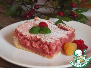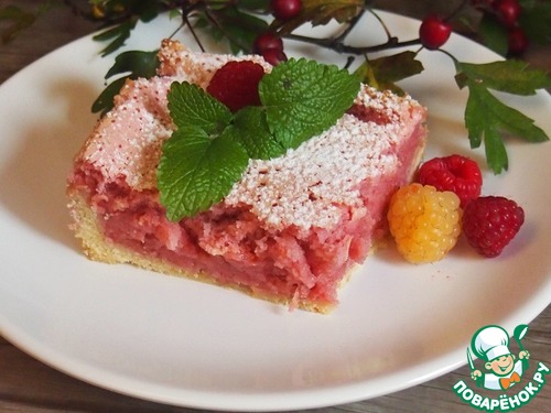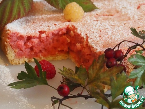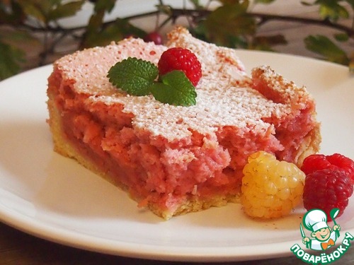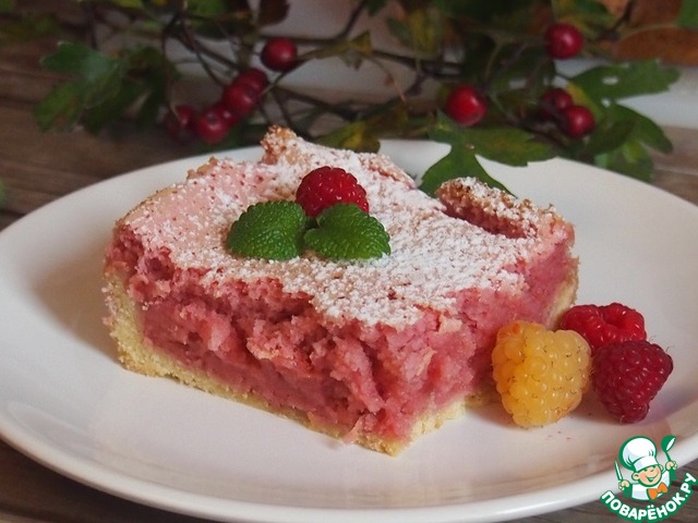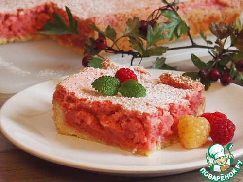 Добавить малиновое пюре, перемешать лопаточкой или венчиком. На испеченный корпус вылить начинку и поставить форму снова в духовку. Выпекать при температуре 180 градусов примерно 30 минут.