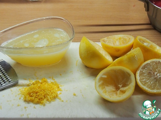 Выжать сок из трех лимонов, а с двух из них на мелкой терке натереть цедру. У меня получилось 240 мл сока.