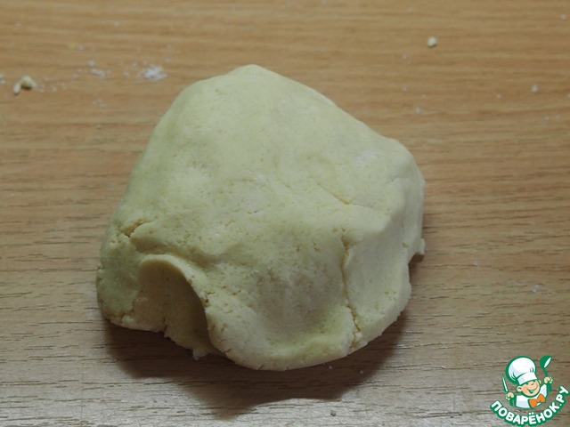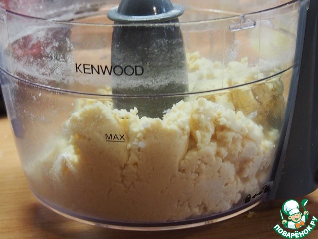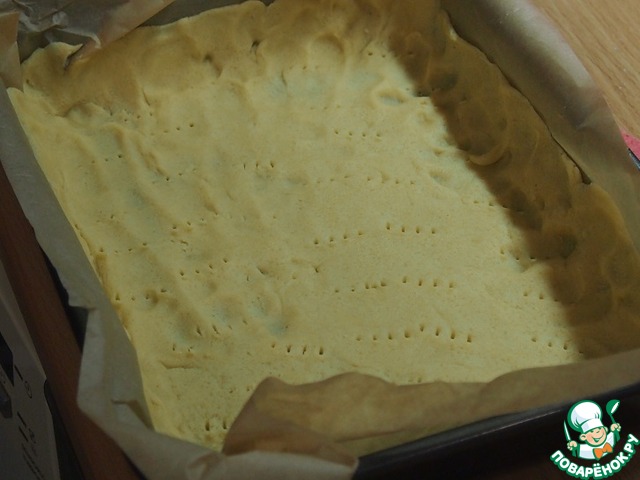 Форму выложить бумагой для выпечки так, чтобы края бумаги превышали края формы. Распределить тесто, сделать невысокие бортики. В тесте сделать вилкой проколы. Поставить форму в разогретую духовку и печь при температуре 170 градусов 20-25 минут.