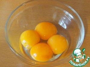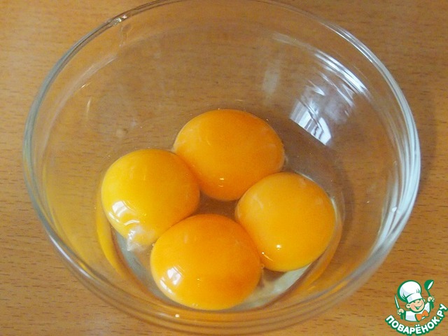 Белки взбить до тугих пиков, постепенно добавляя сахар, потом добавить один желток.