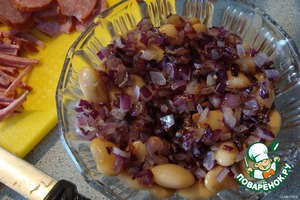 Все очень просто: сливаем жидкость с фасоли (у меня были белые бобы, но это большой роли не играет, раньше брала красную фасоль), добавляем в нее давленый чеснок, соль, перец и зелень по вкусу
