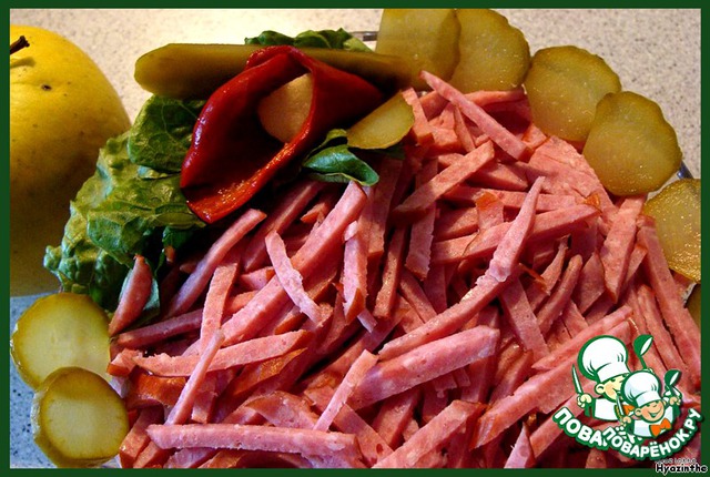 Режем тонкими полосками колбасу - это третий слой. Закрываем салат пленкой или крышкой, оставляем на несколько минут пропитаться