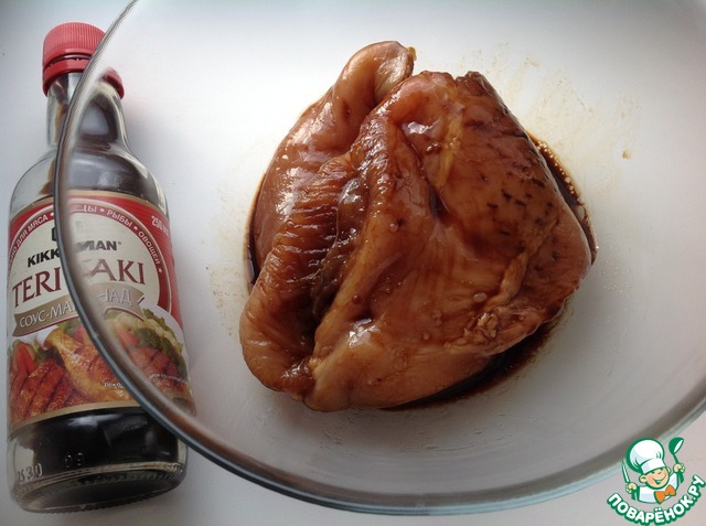 В миску добавить соевый соус Терияки (у меня соевый соус ТМ Киккоман), куриные грудки и хорошо перемешать. Оставить в маринаде на 30 минут при комнатной температуре.