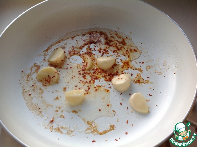 Чеснок нарезать и добавить вместе с хлопьями красного острого перца в эту же сковороду. Пассеровать на небольшом огне до появления аромата около 1 минуты.
