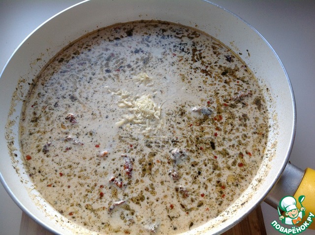 Добавить бульон, сливки, вяленые помидоры, итальянские травы и тертый пармезан, довести до кипения, уменьшить огонь и варить, пока соус немного не загустеет около 3-5 минут. Пармезан можно заменить на плавленный сыр.