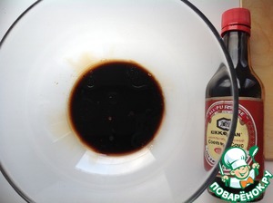 В миску добавить 1 ст. л. растительного масла, лимонный сок, соевый соус (я использую всегда соевый соус ТМ Киккоман). Перемешать.