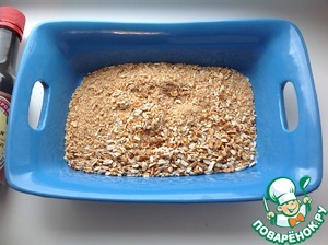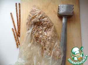 В это время приготовить панировку. Соломку измельчить до состояния грубой крошки. Это можно сделать при помощи кухонного процессора. А можно поместить соломку в прочный полиэтиленовый пакет и измельчить при помощи скалки или молотка.