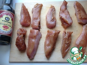 С курицы слить маринад, обсушить грудки бумажным полотенцем. Нарезать длинными ломтиками толщиной 3-3,5 см.