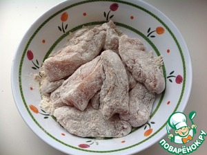 Грудки поместить в миску с мукой и хорошо обвалять со всех сторон.