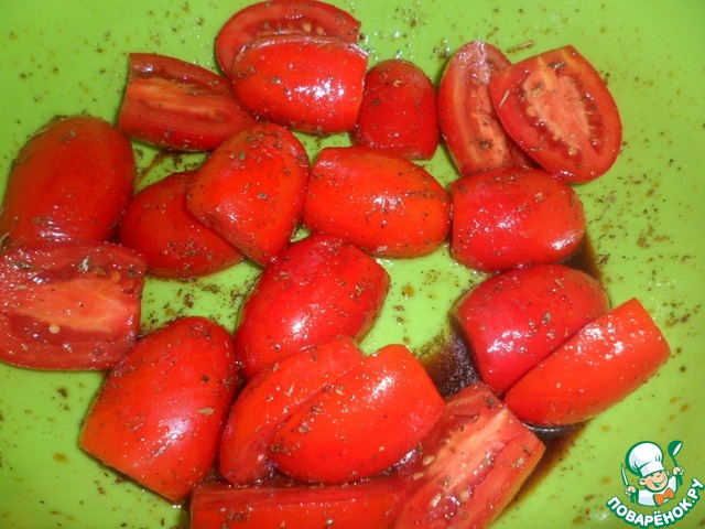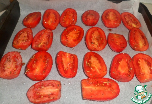 Приготовить форму для запекания, застелить ее пергаментом и разложить помидоры. Маринад не выливать, он нам пригодится. Поставить форму запекаться в горячую духовку при 180°C на 20-25 минут.