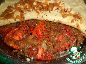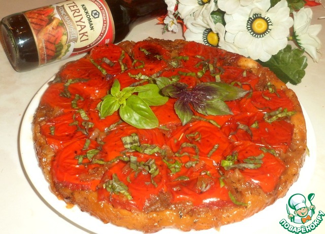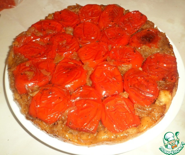 На томаты выложить обжаренный лук (пропустила этот шаг) и накрыть вырезанным тестом.