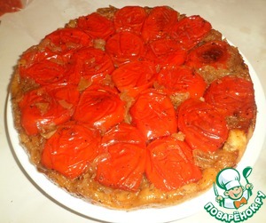 Готовый пирог накрыть сверху тарелкой и перевернуть его.