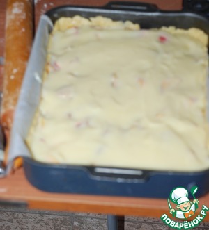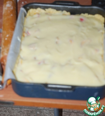 Тесто поделить на 2 неравные части, большую часть раскатать в прямоугольный пласт толщиной 1 см и уложить в смазанную маслом форму, сформировать невысокие бортики. На тесто насыпать несколько ложек молотых сухарей, разровнять, уложить фрукты.