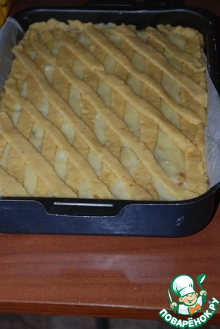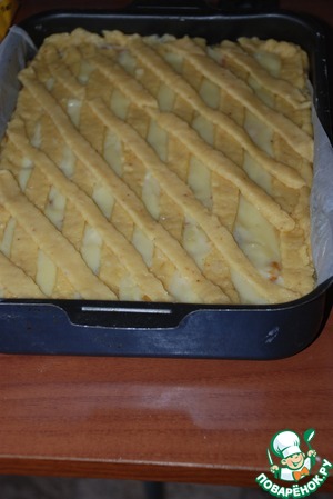 Меньшую часть теста раскатать в тонкий пласт и нарезать тонкие полоски, которые разместить на поверхности пирога в виде решётки.