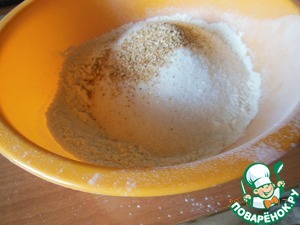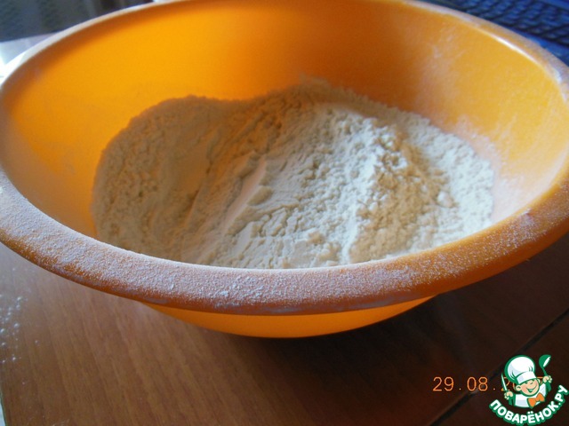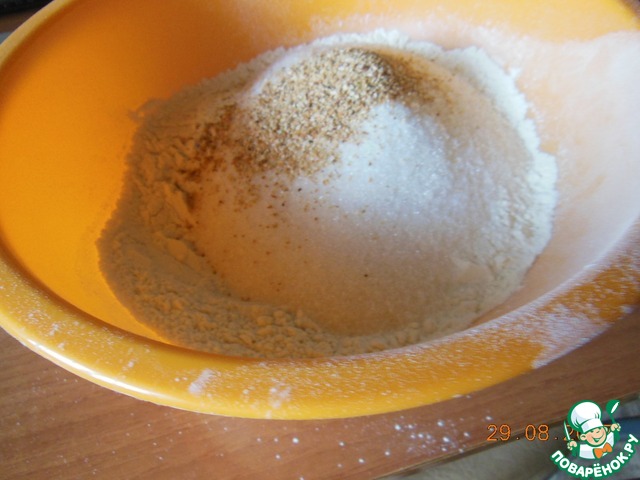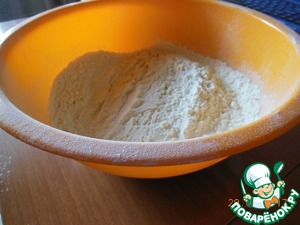 Муку с разрыхлителем просеять в глубокую миску, добавить сахар, соль,