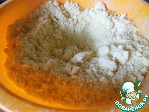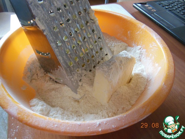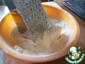 Затем добавить холодное сливочное масло ( я натираю его на тёрке, посыпая тёрку мукой) и перемешать его полностью с мукой, делать это нужно растирая муку и масло руками.