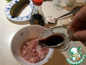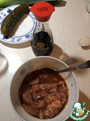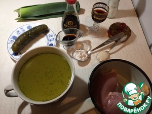 • Вскипятить бульон, опустить в него куриное мясо вместе с маринадом и варить минут 20 до готовности. Затем добавить кружочки огурца, сахар и в конце варки зелень порея.