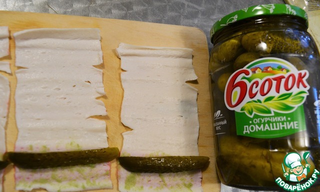 Крабовые палочки разворачиваем, край намазываем горчицей или васаби. На крабовую палочку выкладываем червертинку огурца.