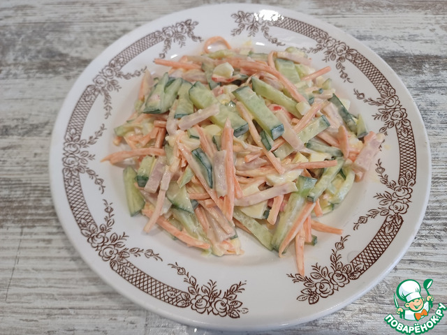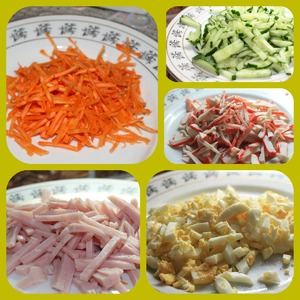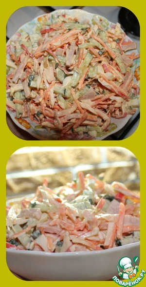 Морковь я натерла через терку (корейскую). Крабовое мясо, огурец, яица, ветчину накрошила. -
