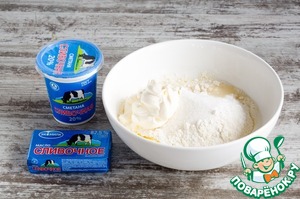 • Для теста смешайте 150 г масла, муку, яйцо, соль, соду, разрыхлитель, 2 ст. л. сахара, 2 ст. л. молока и сметану. Скатайте тесто в шар, заверните в пищевую пленку и оставьте в холодильнике на 30 мин.