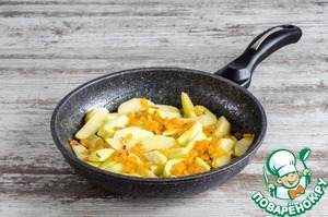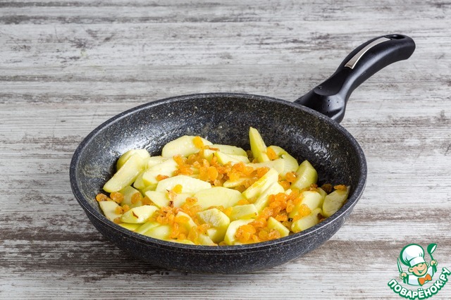 • Яблоки очистите от кожицы, удалите сердцевину и нарежьте небольшими дольками. Потушите их с оставшимся сахаром и 10 г масла до мягкости, 5–7 мин. Добавьте горсть изюма, перемешайте.