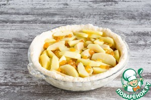 • Форму смажьте оставшимся сливочным маслом. Разделите тесто на две неравные части, большую раскатайте и, плотно прижимая ко дну и краям, выложите в форму. Присыпьте рубленым миндалем. Сверху выложите начинку. Раскатайте вторую часть теста и прикройте ею начинку, защипнув края. Проколите верх пирога вилкой.