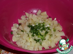 Выкладываем картофель и зеленый лук в чашку. Добавляем чесночное масло.