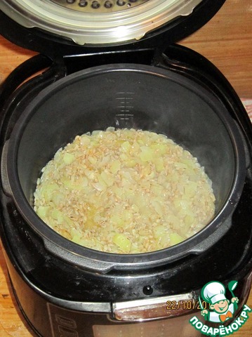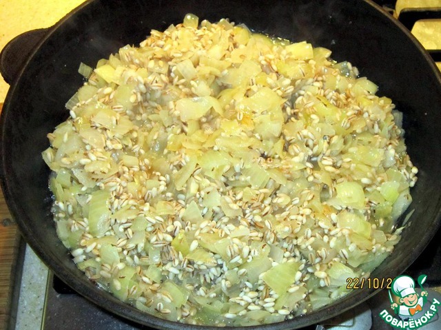 Добавляем крупу к обжаренному луку, хорошо перемешиваем. Продолжаем тушить на медленном огне ещё 5 минут.