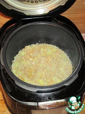 Прошло 5 минут, крупа изменила цвет. Увеличилась в объёме впитав в себя луковый сок вперемешку с маслом. Заготовка готова.
