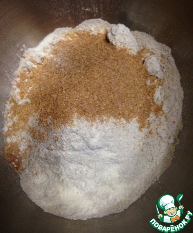 В посуде, где будете замешивать тесто, соединить все сухие ингредиенты. Тщательно перемешать. -