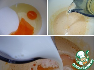 В чашу миксера вбить яйца, добавить ванильный сахар и сахар. Взбить в пышную пену. Влить растительное масло и молоко, смешать.