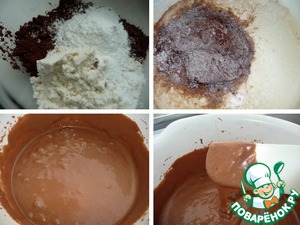 Часть муки смешать с разрыхлителем теста и какао-порошком, добавить в чашу, аккуратно перемешать. Добавить оставшуюся муку, перемешать до однородного состояния. Тесто не густое, легко спадает с лопатки.