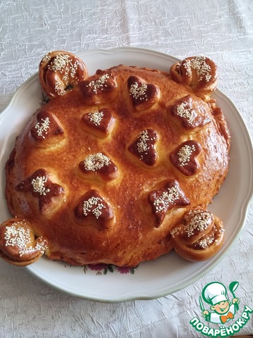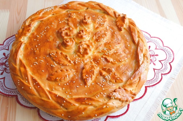 Пирог смазать взбитым яйцом, посыпать кунжутом и отправить в разогретый до 180-190*С духовой шкаф.