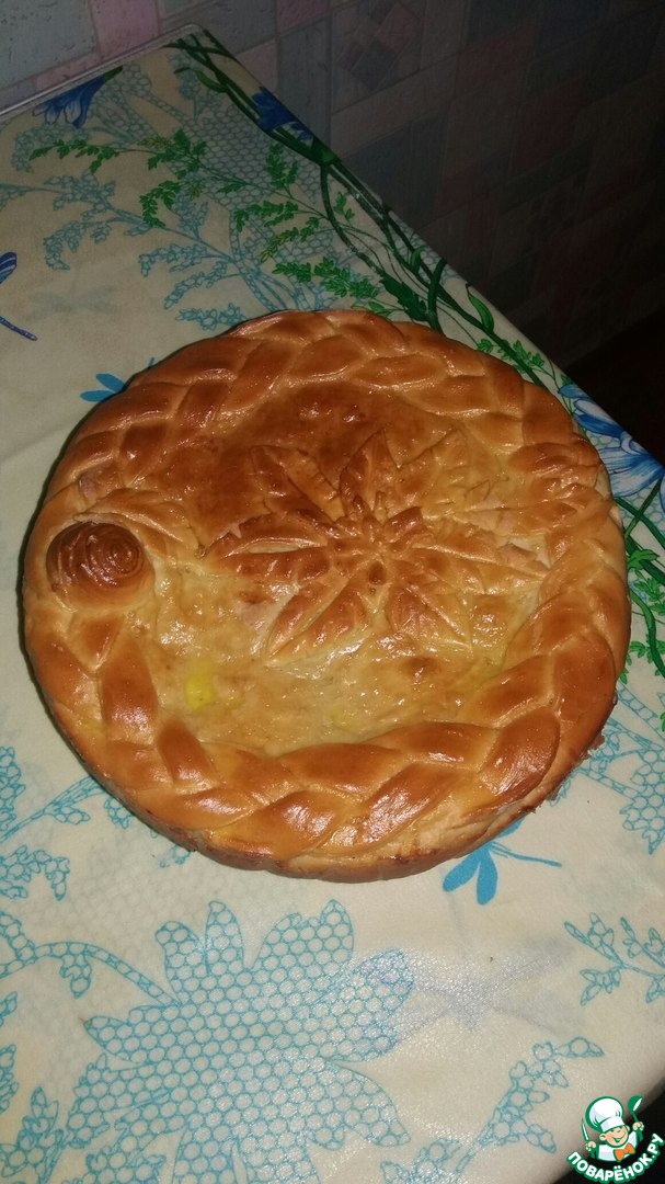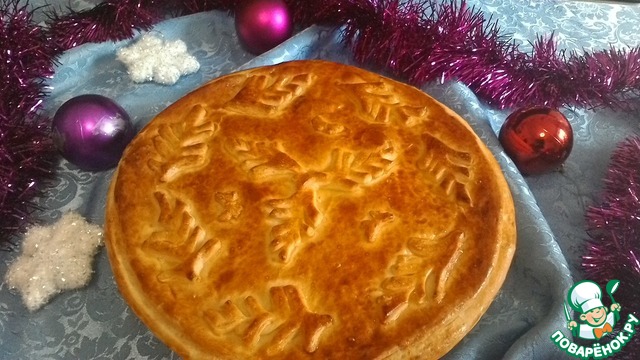 Вторую часть теста раскатать в пласт, вырезать круг, перенести круг на поверхность начинки, края скрепить по кругу.