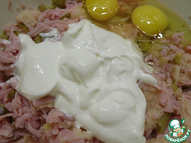 Начинку перемешать, добавив сметану, яйца, соль и перец.