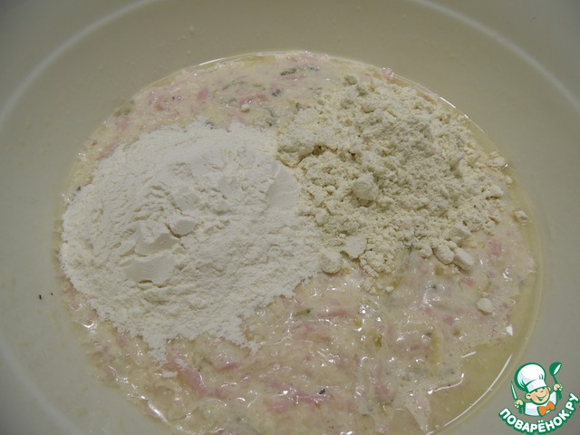 В полученную массу добавить оба вида муки, замесить тесто. Оно должно быть чуть гуще, чем для оладьев.